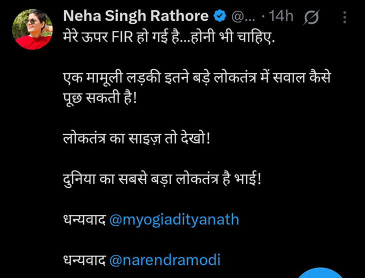 मामला दर्ज होने के बाद नेहा राठौर ने सोशल मीडिया पर लिखा- मेरे ऊपर लखनऊ में FIR दर्ज हो चुकी है। क्या कोई वकील मेरी मदद कर सकता है? मेरे पास वकील की फीस देने के लिए पैसा नहीं है। मेरे ICICI बैंक अकाउंट में सिर्फ 519 रुपए हैं। जिसमें से 500 रुपए तबला वादक को देकर कल मैं नया गीत रिकॉर्ड करुंगी।