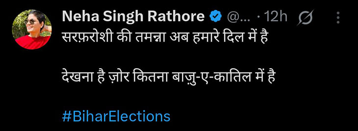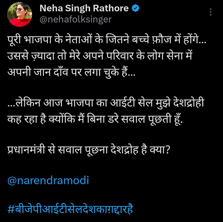 नेहा सिंह राठौर ने कहा- बताइए मोदी जी कि क्या कश्मीर की आजादी आतंकियों की मेहरबानी पर टिकी है क्या? कब तक कश्मीर में शांति बहाली के नाम पर वोट बटोरने और देशवासियों की लाशें बटोरने का काम एक साथ होता रहेगा? आपके प्रधानमंत्री बनने के बाद से देश में लाखों लोग मारे जा चुके हैं और आपने कभी कोई जिम्मेदारी नहीं ली। आप देशवासियों की मौतों की जिम्मेदारी कब लेंगे? क्या देशवासियों का जीवन आपकी गलतियों पर न्योछावर होने के लिए है।