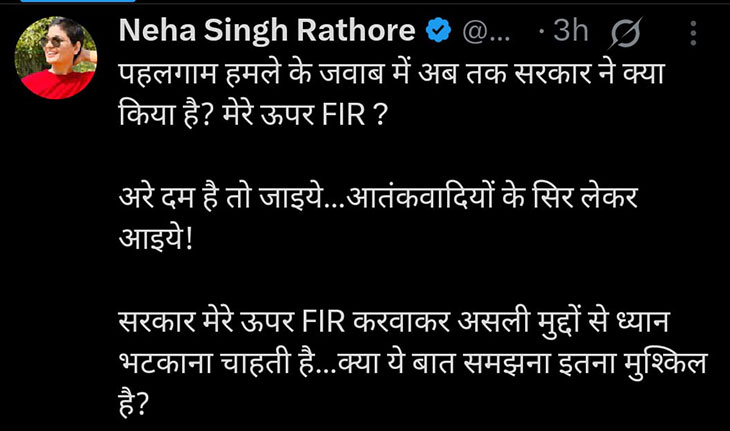 नेहा राठौर ने वीडियो जारी कर कहा-कश्मीर के पहलगाम में आतंकी हमला हुआ और पर्यटकों की हत्या कर दी गई। ईश्वर उनकी आत्मा को शांति दे। आप कहां सोए हैं चौकीदार जी। आपकी चौकीदारी में कैसे चूक हो गई। आंख लग गई थी क्या? आपने तो नोटबंदी करके आतंकियों की कमर तोड़ दी थी। फिर ये कैसे हो गया।