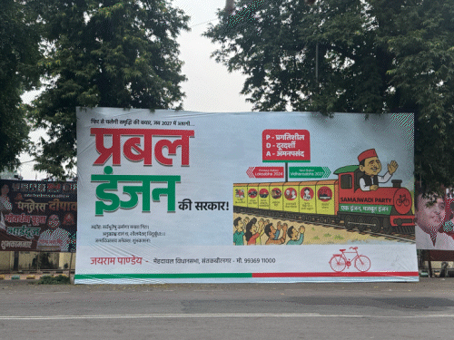 होर्डिंग पर लिखा है- फिर से चलेगी समृद्धि की बयार, जब 2027 में आएगी प्रबल इंजन की सरकार। अखिलेश यादव की तस्वीर के साथ धनतेरस, दीपावली, गोवर्धन पूजा और भाईदूज की शुभकामनाएं भी दी गई हैं।