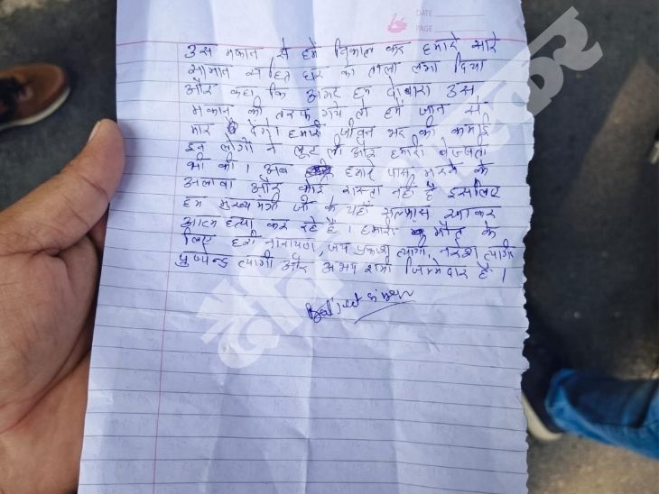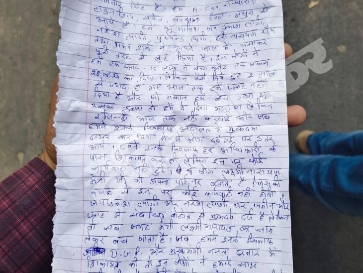 बलजीत की जेब में एक एप्लीकेशन मिली। इसमें लिखा है- मथुरा के भूमाफिया जयप्रकाश त्यागी, नरेश त्यागी, पुष्पेंद्र त्यागी, हरि नारायण राय और अभय शर्मा ने उन्हें लूट लिया है। इन लोगों से एक प्लॉट 15 लाख और एक मकान 28 लाख रुपए में खरीदा था। 2 साल हो गए लेकिन मकान की रजिस्ट्री नहीं कराई। बाद में घर से बाहर निकाल दिया। वहीं, प्लॉट पर भी कब्जा नहीं दिया।
