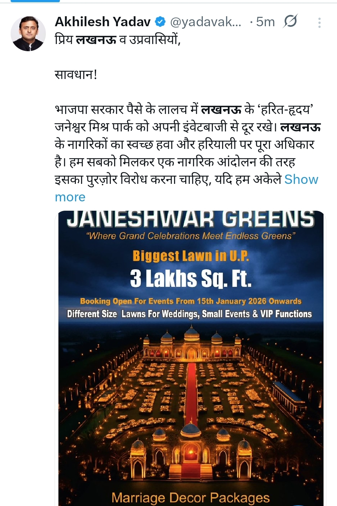 सोशल मीडिया पर साझा किए गए पोस्ट में अखिलेश यादव ने साफ शब्दों में कहा कि जनेश्वर मिश्र पार्क जनता की सुविधा के लिए बनाया गया है और इसे उसी मकसद के लिए उपलब्ध रहना चाहिए। उन्होंने चेताया कि भाजपा सरकार पैसों के लालच में लखनऊ के इस हरित-हृदय को इवेंटबाजी का केंद्र बना रही है, जो शहर की स्वच्छ हवा और हरियाली के अधिकार के खिलाफ है।