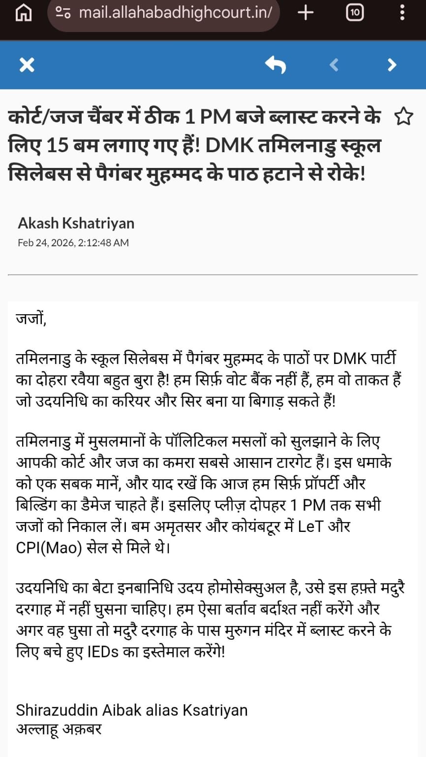 कोर्ट/जज चैंबर में ठीक 1PM बजे ब्लास्ट करने के लिए 15 बम लगाए गए हैं। DMK तमिलनाडु स्कूल सिलेबस से पैगंबर मुहम्मद के पाठ हटाने से रोकें। जजों, तमिलनाडु के स्कूल सिलेबस में पैगंबर मुहम्मद के पाठों पर DMK पार्टी का दोहरा रवैया बहुत बुरा है! हम सिर्फ वोट बैंक नहीं हैं। हम वह ताकत हैं जो उदयनिधि का करियर और सिर बना या बिगाड़ सकते हैं।